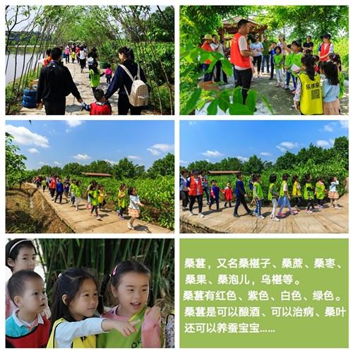满园的桑葚缀满枝头,有的长如春蚕,有的紫如宝石,红彤彤、紫盈盈的,散发着诱人的香味。果桑植物园的“柚子”老师一边带领大家参观,一边为孩子们讲解果桑的科普知识。